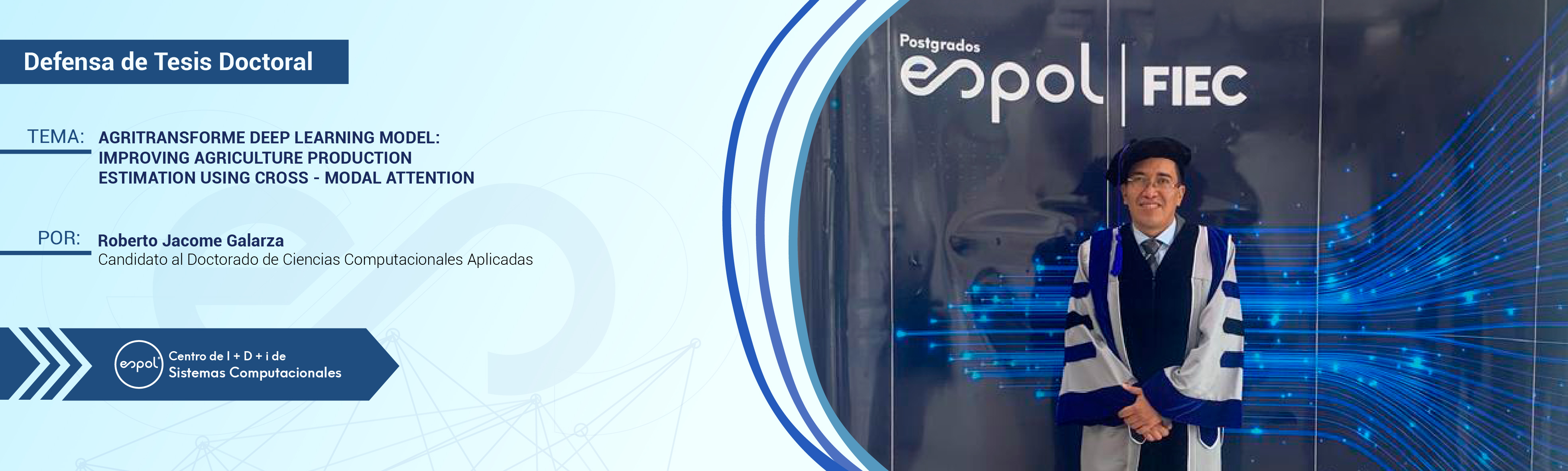 El pasado viernes 16 de enero, Roberto Jácome Galarza, estudiante del programa de Doctorado en Ciencias Computacionales Aplicadas (DCCA), realizó con éxito la defensa de su tesis doctoral titulada: “AgriTransformer Deep learning model: improving agriculture production estimation using cross-modal attention”, que se centra en el uso de arquitecturas avanzadas de aprendizaje profundo para optimizar la estimación de la producción agrícola a través de la atención cruzada de datos.